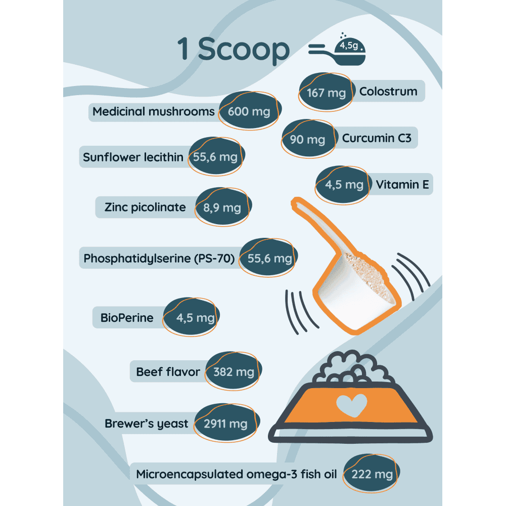 - Complete formula: mushrooms + colostrum + yeast + omega-3 + vitamin E + curcumin + zinc + PS-70
