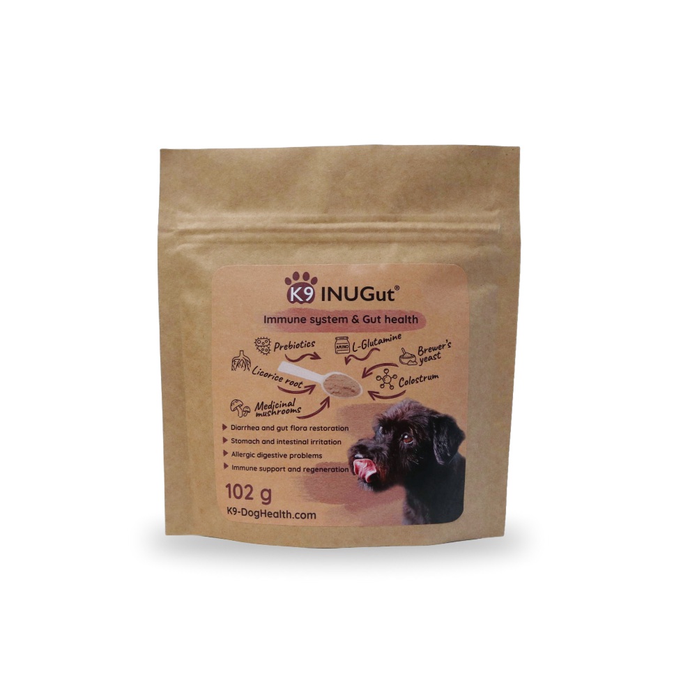 K9 INUGut® is a premium-quality, complex dietary supplement for dogs. With the combination of natural medicinal mushrooms (Chaga, Lion’s Mane), colostrum, brewer’s yeast beta-glucan, FOS prebiotic, L-glutamine, and DGL licorice root extract, it supports the balance of gut flora and the function of the immune system. It helps restore digestive comfort, reduces inflammation, and strengthens the body’s defenses.